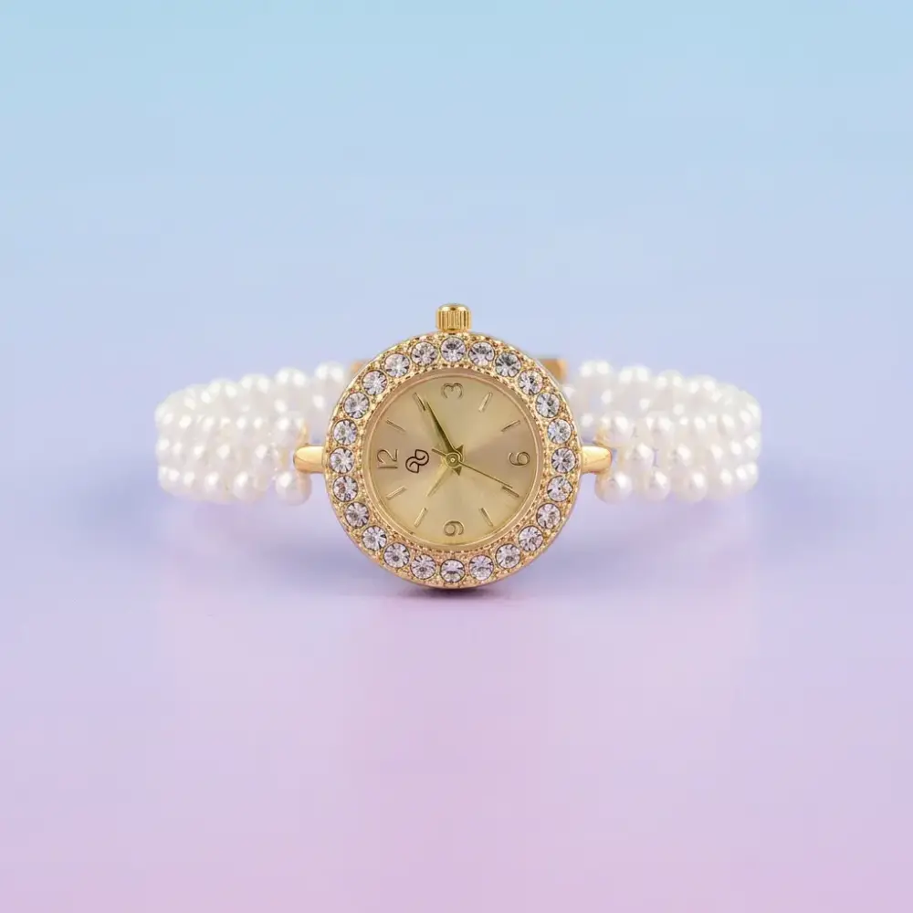 ساعة أزياء ذهبية سوار لؤلؤ وفصوص